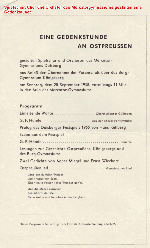 Am 15.September 1962 fand aus Anlaß des 10jährigen Bestehens der Patenschaft Duisburg-Königsberg in der Aula eine Feierstunde statt. |