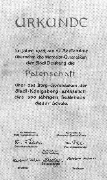 Auf einer "außerordentlichen" allgemeinen Konferenz am 25.11.1957 wurde am Mercator-Gymnasium die Übernahme der Patenschaft für das ehemalige Burg-Gymnasium Königsberg i.Pr. einstimmig beschlossen. OStR Dr.Pape - inzwischen kommissarischer Leiter des Mercator-Gymnasiums - hatte die Konferenz in Gesprächen mit den ehemaligen Leiter dieser Schule, OStD.i.R. Dr.Falcke, vorbereitet und ihn zu dieser Konferenz eingeladen. OStD.i.R.Dr.Falcke trug der Konferenz die entsprechende Bitte um die Übernahme einer Patenschaft vor. Für den erkrankten Schulleiter leitete der damalige Verwaltungsoberstudienrat Caumanns die Konferenz, die nach ausführlichen Stellungsnahmen seitens der Lehrerschaft schließlich einhellig der Patenschaft zustimmte. Nach entsprechenden Vorbereitungen wurde die Übernahme der Patenschaft aus Veranlassung des 300jährigen Bestehens der Burgschule Königsberg i.Pr. mit einer Urkunde am 27.September 1958 "besiegelt".