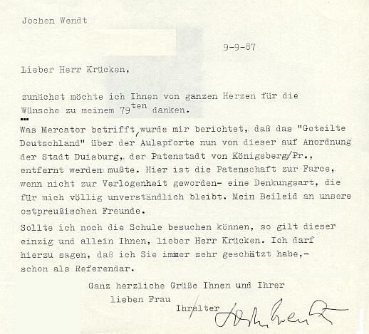 Diese Stiftung sollte die "Patenschaftsgemeinschaft Mercator-Gymnasium und Burgschule Königsberg" festigen und "der Aufrechterhaltung und Pflege der Tradition und Erinnerung an die alte, ehrwürdige Burgschule" dienen. Aus damit gegebenem Anlaß werden den Abiturienten die "Alberten" überreicht. Am 26.Oktober 1968 feiert das Mercator-Gymnasium den "Tag der Königsberger" anläßlich der 10jährigen Patenschaft Burgschule / Mercator-Gymnasium. Nach dem Ostpreußenlied, gesungen vom Schulchor, begrüßt OStD Dr.Oberwinder die anwesenden Oberstufenschüler, Lehrer und Burgschul-Gäste. Der Chor singt "O Täler weit, o Höhen" und "Innsbruck, ich muß dich lassen". Nach einer Lesung "Erbe und Verpflichtung" (Texte von Theodor Litt) hält Dr.Blankenstein, ein ehemaliger Burschüler, die Festansprache. Einer Lesung "Lob der Freundschaft" (Text von Simon Dach) folgt die Ouvertüre aus Händels Rodrigo-Suite. Anschließend zeichnet Ltd.Reg.Dir.Erzberger drei Schüler im Sinne der Dr.Friedrich-Schroeder-Stiftung aus. Der Festakt endet nach der Aufführung von Händels "Festmusik". Am Abend findet ein Ball in der Aula statt, zu dem die Oberstufenschüler, die Lehrer, die ehemaligen Burg- und Mercator-Schüler mit ihren Damen eingeladen sind. Anläßlich der 10jährigen Patenschaft wird das "Burgschulzimmer" eingerichtet. Im Jahre 1976 stiftet die Burgschulgemeinschaft Königsberg (Pr.) e.V. die Festschrift zum 75-jährigen Bestehen des Mercator-Gymnasiums. OStD. Dr. Heinz Oberwinder wird bei seinem Ausscheiden aus dem aktiven Schuldienst die Ehrenmitgliedschaft in der Burgschulgemeinschaft angetragen. Mit der Überreichung einer Ehrenurkunde wird die Ehrenmitgliedschaft vollzogen. |